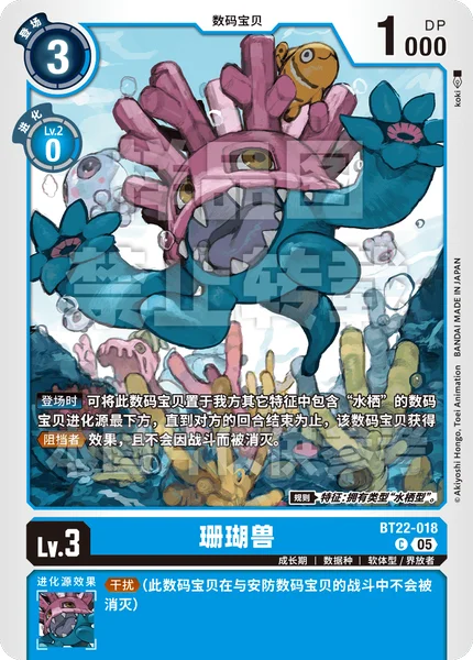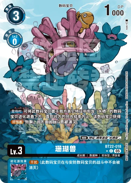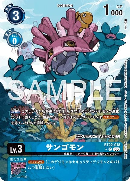 On Play By placing this Digimon as the bottom digivolution card of any of your other Digimon with [Aqua] or [Sea Animal] in any of their traits, until your opponent's turn ends, that Digimon gains Blocker and can't be deleted in battle. Rule Trait: Has [Aquatic] Type.