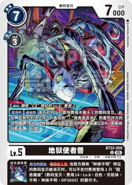 On Play When Digivolving Delete 1 of your opponent's Digimon with a play cost of 5 or less. Then, if you have [Arata Sanada] or [Eater Adam], your opponent's effects can't reduce this Digimon's DP or return it to hands or decks until their turn ends.