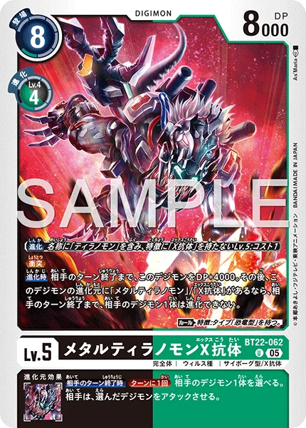 When Digivolving This Digimon gets +4000 DP until your opponent's turn ends. Then, if [MetalTyrannomon] or [X Antibody] is in this Digimon's digivolution cards, 1 of your opponent's Digimon can't digivolve until their turn ends. Rule Trait: Has [Dinosaur] Type.