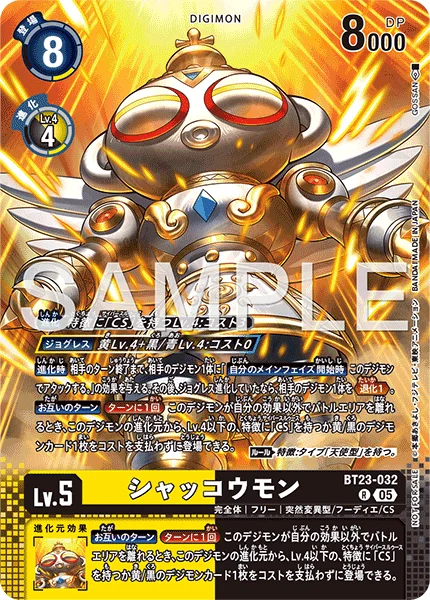 All Turns Once Per Turn When this Digimon would leave the battle area other than by your effects, you may play 1 level 4 or lower yellow, black or [CS] trait Digimon card from its digivolution cards without paying the cost. Rule Trait: Has [Angel] Type.