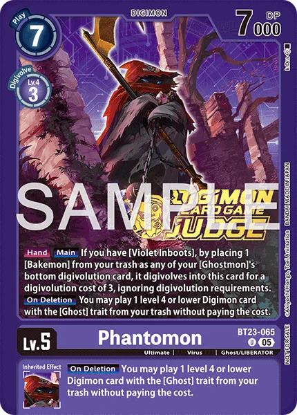 Hand Main If you have [Violet Inboots], by placing 1 [Bakemon] from your trash as any of your [Ghostmon]'s bottom digivolution card, it digivolves into this card for a digivolution cost of 3, ignoring digivolution requirements.