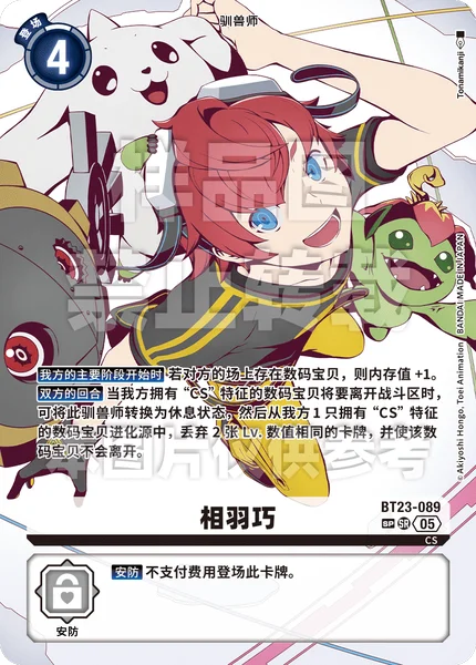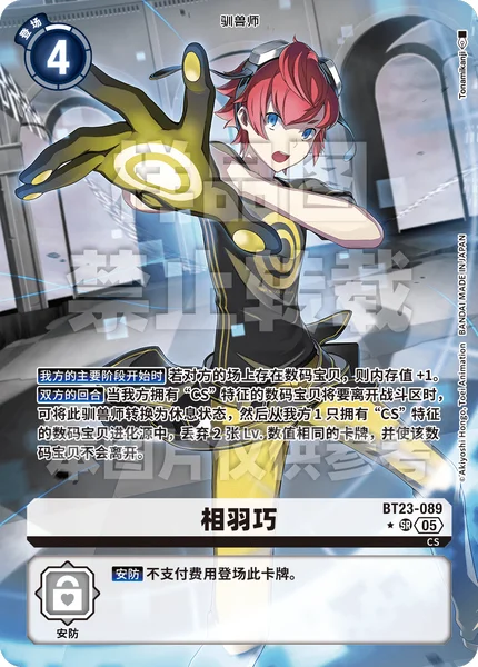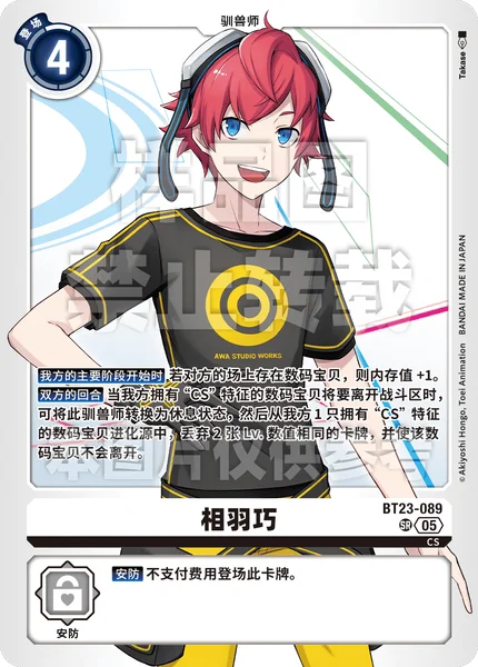All Turns When any of your Digimon with the [CS] trait would leave the battle area, by suspending this Tamer and trashing 2 same-level cards from 1 of your [CS] trait Digimon's digivolution cards, they don't leave.