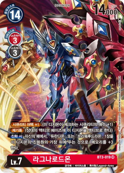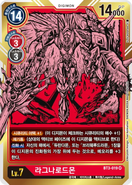 Security Attack +1 (This Digimon checks 1 additional security card.)Reboot (Unsuspend this Digimon during your opponent's unsuspend phase.)When Digivolving You may place 1 [Durandamon] or [BryweLudramon] from your hand on top of this card's digivolution cards to gain 3 memory.
