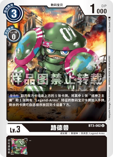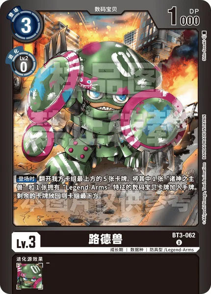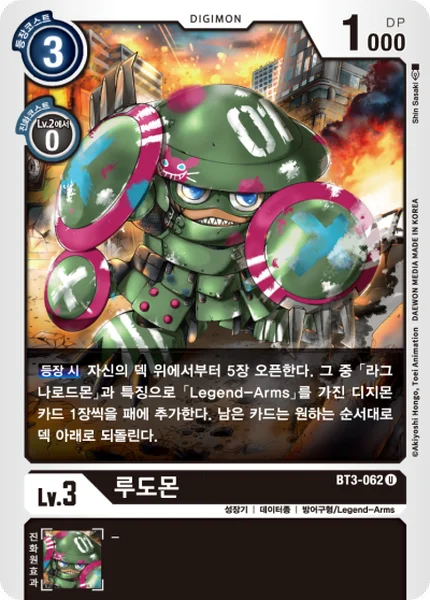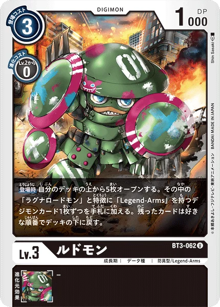 On Play Reveal the top 5 cards of your deck. Add 1 [RagnaLoardmon] and 1 Digimon card with the [Legend-Arms] trait among them to the hand. Return the rest to the bottom of the deck.
