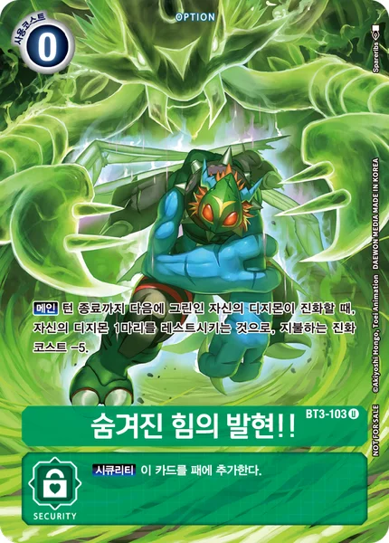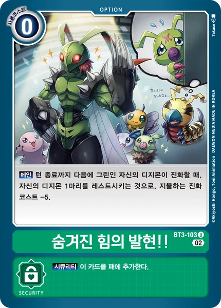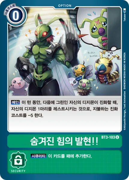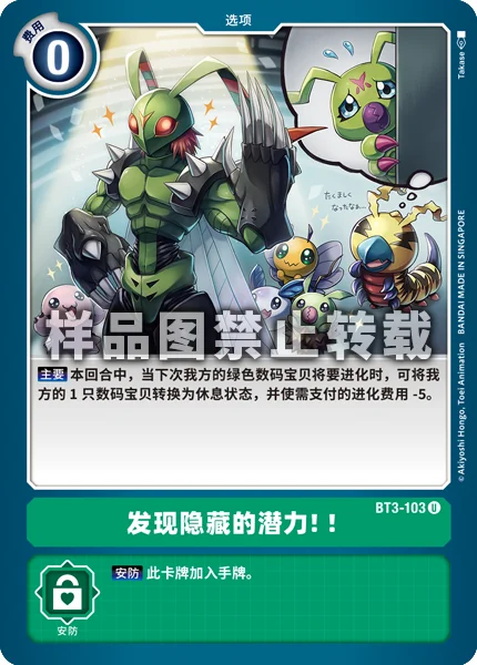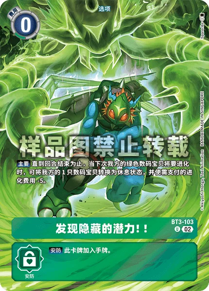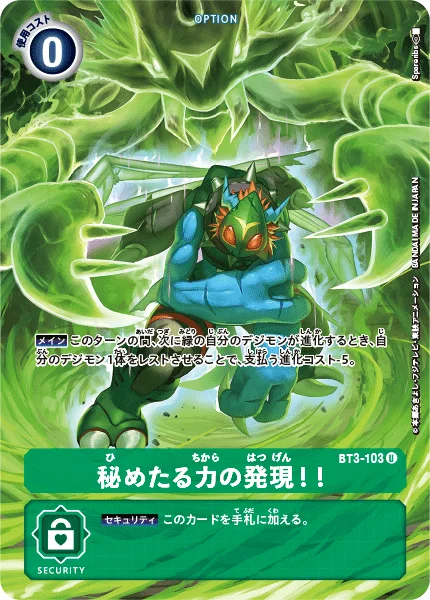 Main The next time one of your green Digimon digivolves this turn, you may suspend 1 of your Digimon to reduce the memory cost of the digivolution by 5.