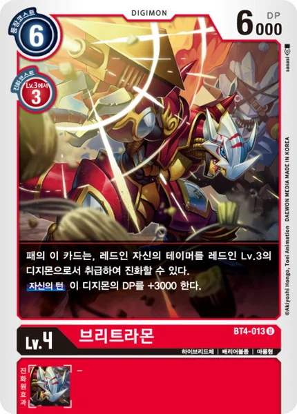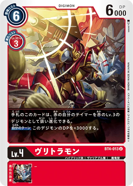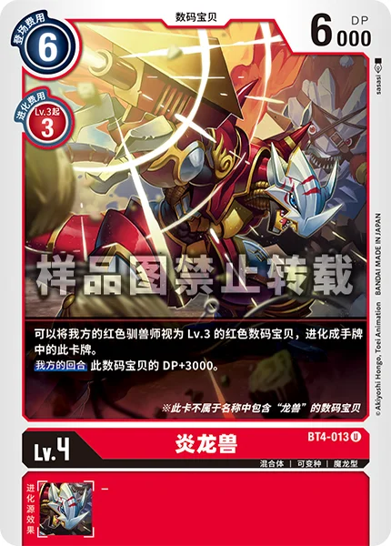 You may Digivolve this card from your hand onto one of your red Tamers as if the Tamer is a level 3 Digimon.Your Turn This Digimon gets +3000 DP.