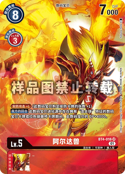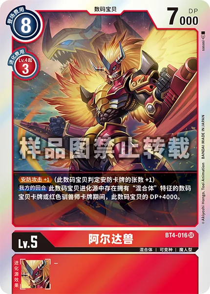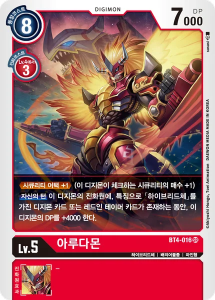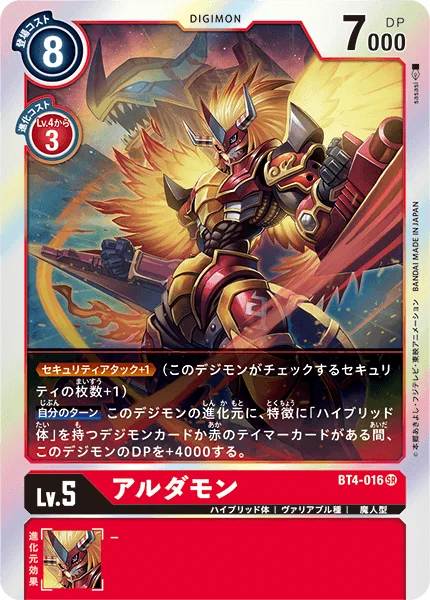 Security Attack +1 (This Digimon checks 1 additional security card.)Your Turn While this Digimon's digivolution cards include a Digimon card with [Hybrid] in its form or a red Tamer card, it gets +4000 DP.