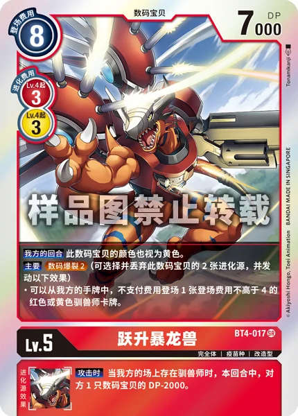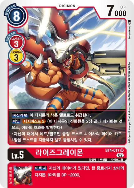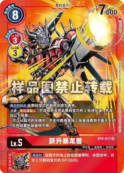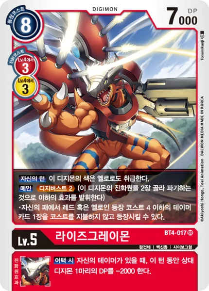 Your Turn This Digimon is also treated as yellow.Main Digi-Burst 2 (Trash 2 of this Digimon's digivolution cards to activate the effect below.)・You may play a red or yellow Tamer card with a play cost of 4 or less from your hand without paying its memory cost.