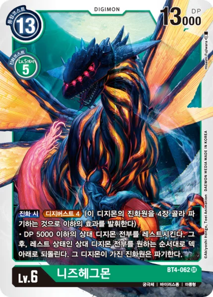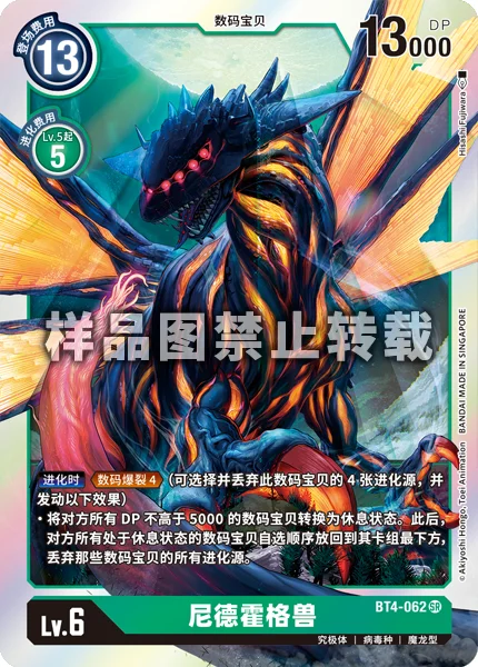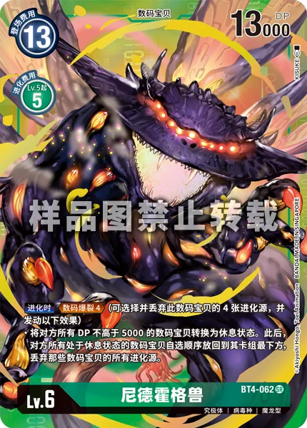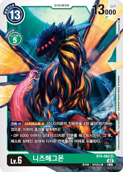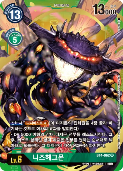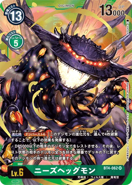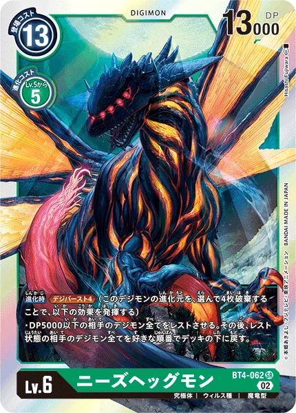 When Digivolving Digi-Burst 4 (Trash 4 of this Digimon's digivolution cards to activate the effect below.)・Suspend all of your opponent's Digimon with 5000 DP or less. Then, place all of your opponent's suspended Digimon at the bottom of their owners' decks in any order. Trash all of the digivolution cards of those Digimon.