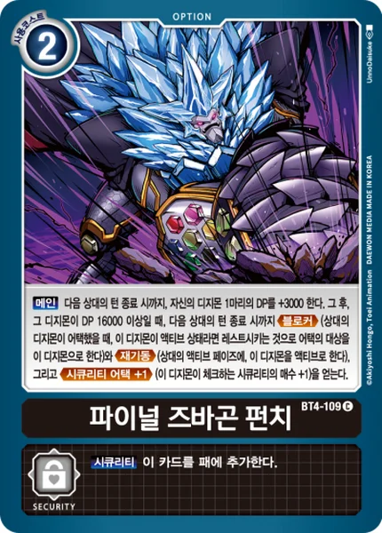 Main 1 of your Digimon gets +3000 DP until the end of your opponent's next turn. Then, if that Digimon has 16000 DP or more, that Digimon gains Blocker (When an opponent's Digimon attacks, you may suspend this Digimon to force the opponent to attack it instead), Reboot (Unsuspend this Digimon during your opponent's unsuspend phase), and Security Attack +1 (This Digimon checks 1 additional security card) until the end of your opponent's next turn.