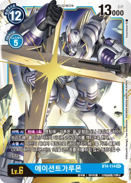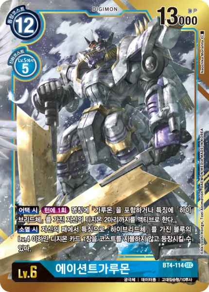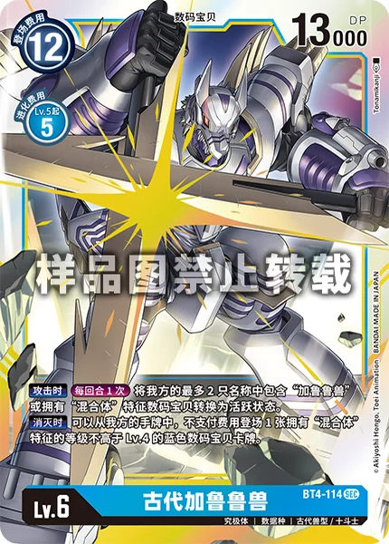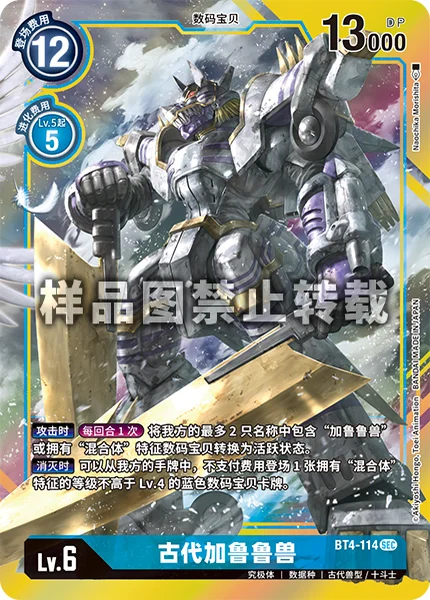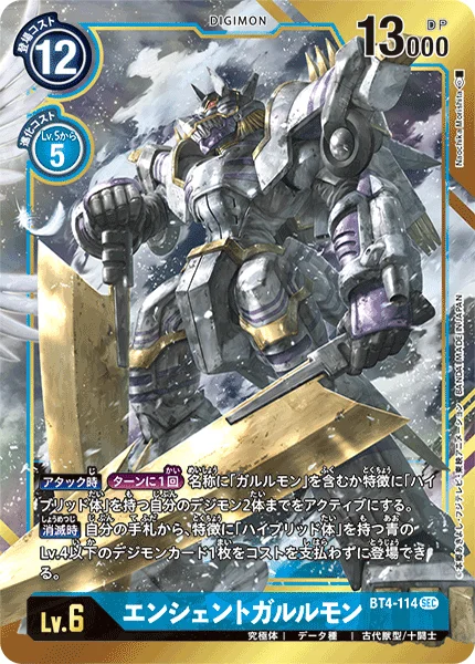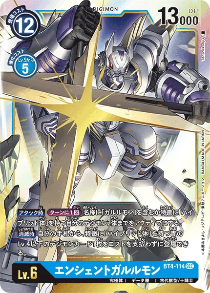 When AttackingOnce Per Turn You may unsuspend up to 2 of your Digimon with [Garurumon] in their names or [Hybrid] in their forms.On Deletion You may play 1 blue level 4 or lower Digimon card with [Hybrid] in its form from your hand without paying its memory cost.