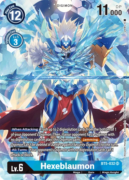 When Attacking Trash up to 2 digivolution cards from the bottom of 1 of your opponent's Digimon. Then, if your opponent has a Digimon with no digivolution cards in play, this Digimon gains Jamming (This Digimon can't be deleted in battles against Security Digimon) for the turn.All Turns Your opponent's Digimon with no digivolution cards can't attack or block.