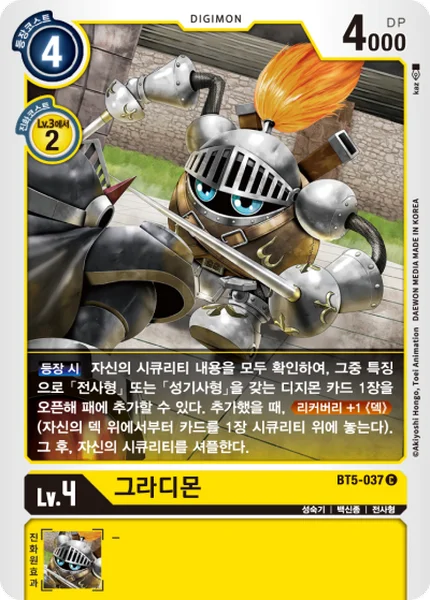 On Play You may search your security stack for 1 Digimon card with [Warrior] or [Holy Warrior] in its type, reveal it, and add it to your hand. If you do, trigger Recovery +1 (Deck). (Place the top card of your deck on top of your security stack.) Then, shuffle your security stack.