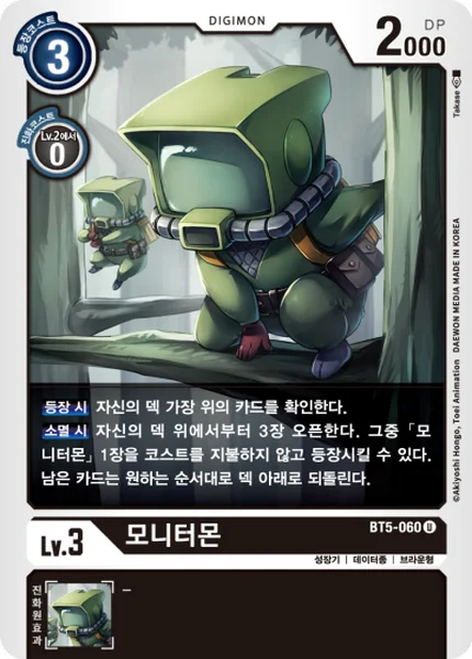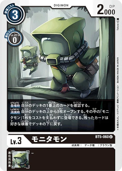 On Play Look at the top card of your deck.On Deletion Reveal 3 cards from the top of your deck. You may play 1 [Monitamon] among them without paying its memory cost. Place the remaining cards at the bottom of your deck in any order.