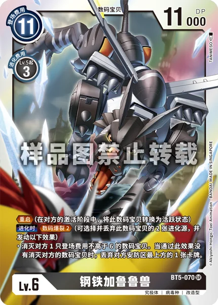 Reboot (Unsuspend this Digimon during your opponent's unsuspend phase.)When Digivolving Digi-Burst 2 (Trash 2 of this Digimon's Digivolution cards to activate the effect below.)・Delete 1 of your opponent's Digimon with a play cost of 6 or less. If no Digimon was deleted by this effect, trash the top card of your opponent's security stack.