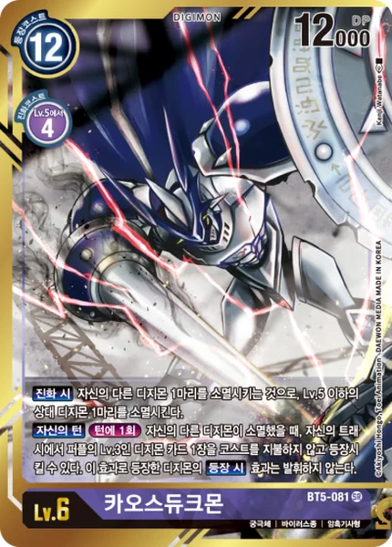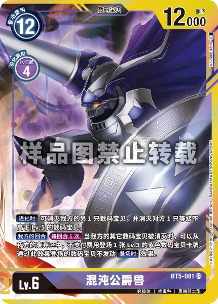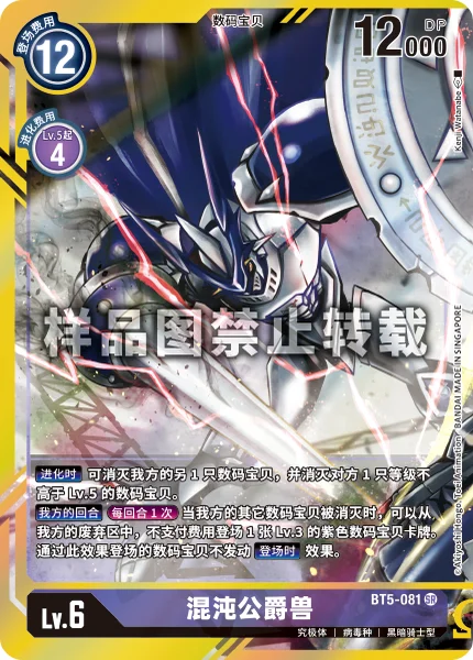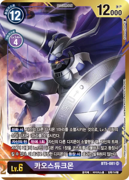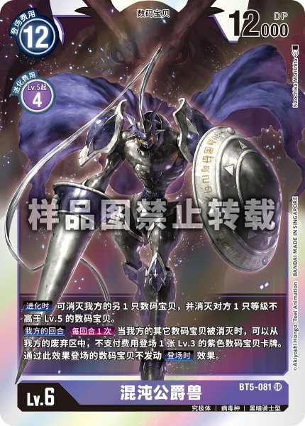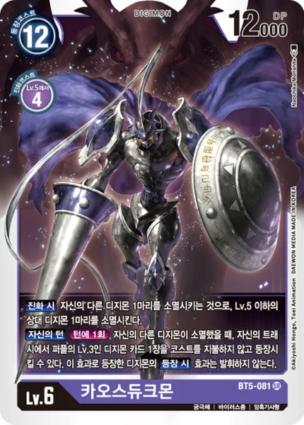 When Digivolving You may delete 1 of your other Digimon to delete 1 of your opponent's level 5 or lower Digimon.Your TurnOnce Per Turn When one of your other Digimon is deleted, you may play 1 level 3 purple Digimon card from your trash without paying its memory cost. Any On Play effects on Digimon played with this effect don't activate.