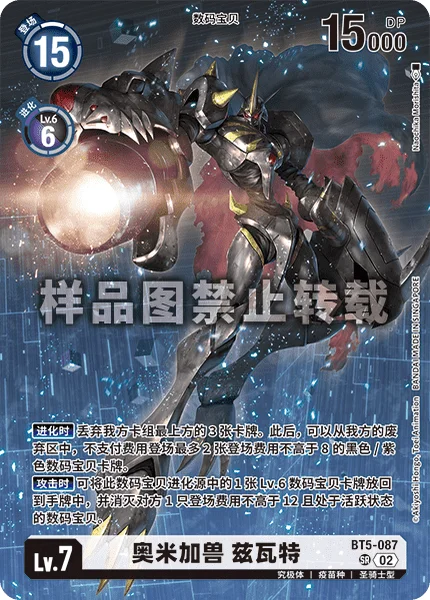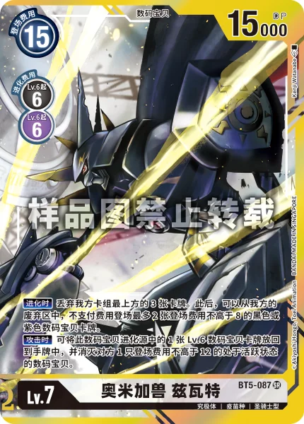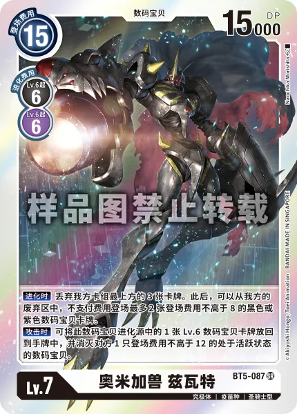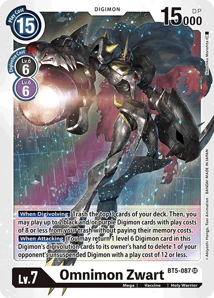 When Digivolving Trash the top 3 cards of your deck. Then, you may play up to 2 black and/or purple Digimon cards with play costs of 8 or less from your trash without paying their memory costs.When Attacking You may return 1 level 6 Digimon card in this Digimon's digivolution cards to its owner's hand to delete 1 of your opponent's unsuspended Digimon with a play cost of 12 or less.