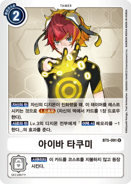 Your Turn When one of your Digimon digivolves, you may suspend this Tamer to trigger Draw 1. (Draw 1 card from your deck.)All Turns All level 3 Digimon gain "When Attacking Lose 1 memory."