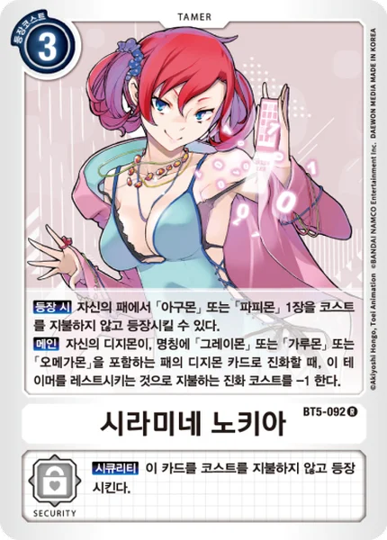 On Play You may play 1 [Agumon] or [Gabumon] from your hand without paying its memory cost.Main When digivolving one of your Digimon into a Digimon card in your hand with [Garurumon], [Omnimon], or [Greymon] (other than [DoruGreymon], [BurningGreymon], or [DexDoruGreymon]), in its name, you may suspend this Tamer to reduce the memory cost of the digivolution by 1.