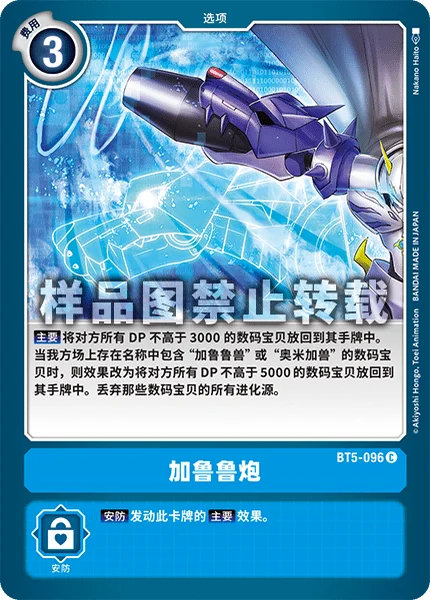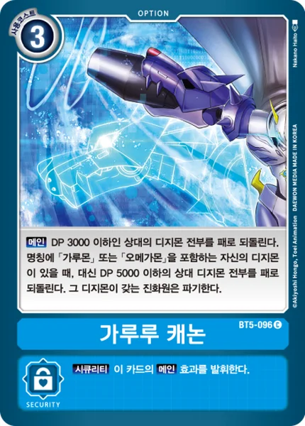 Main Return all of your opponent's Digimon with 3000 DP or less to their owners' hands. If you have a Digimon in play with [Garurumon] or [Omnimon] in its name, return all of your opponent's Digimon with 5000 DP or less to their owners' hands instead. Trash all of the digivolution cards of those Digimon.
