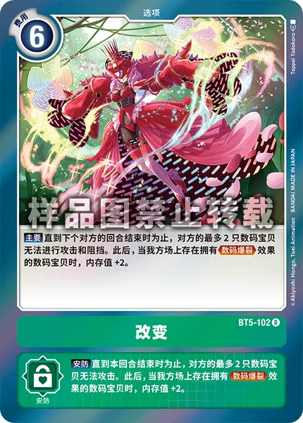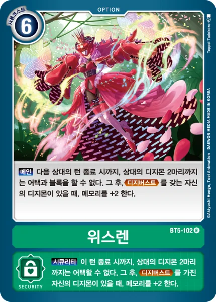 Security Up to 2 of your opponent's Digimon can't attack until the end of the turn. Then, if you have a Digimon with Digi-Burst in play, gain 2 memory.