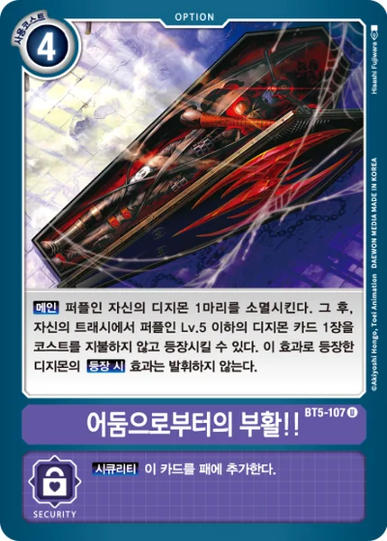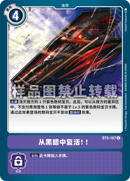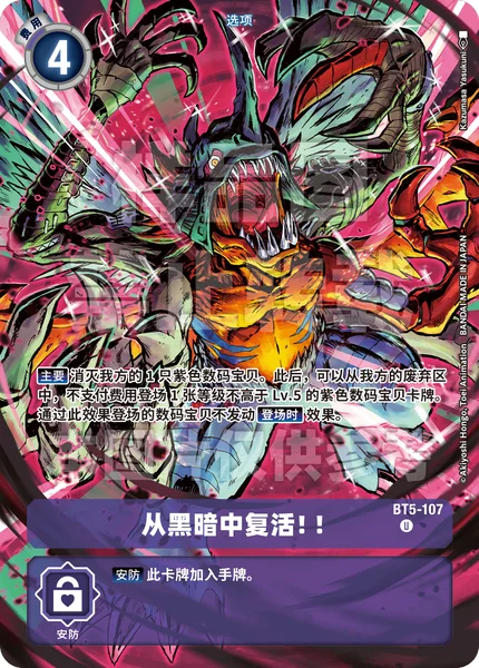 Main Delete 1 of your purple Digimon. Then, you may play 1 level 5 or lower purple Digimon card from your trash without paying its memory cost. Any On Play effects on Digimon played with this effect don't activate.