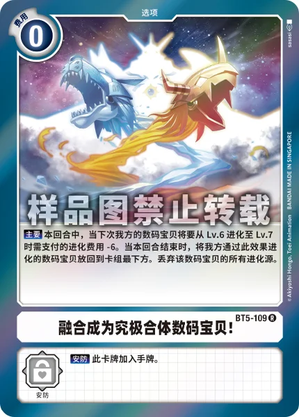 Main The next time one of your Digimon digivolves from level 6 to level 7 this turn, reduce the memory cost of the digivolution by 6. At the end of the turn, return the Digimon that digivolved with this effect to the bottom of its owner's deck. Trash all of the digivolution cards of that Digimon.