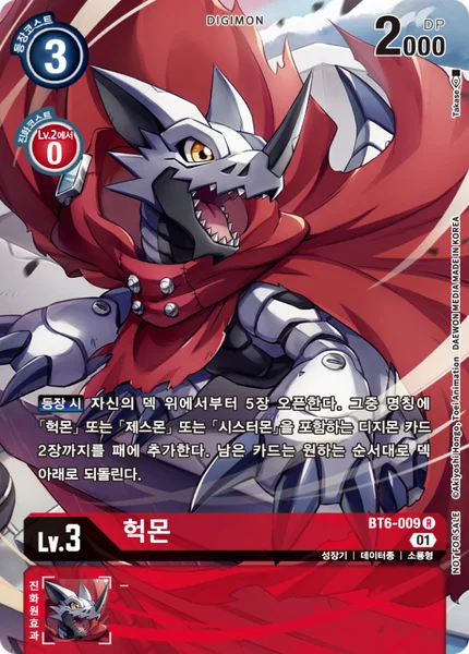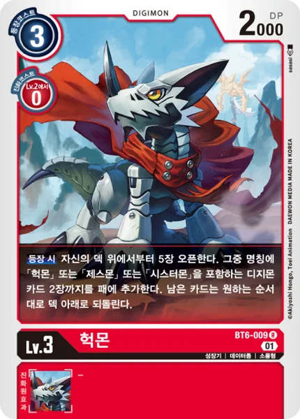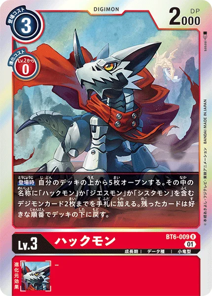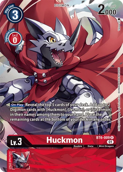 On Play Reveal the top 5 cards of your deck. Add up to 2 Digimon cards with [Huckmon], [Jesmon], or [Sistermon] in their names among them to your hand. Place the remaining cards at the bottom of your deck in any order.