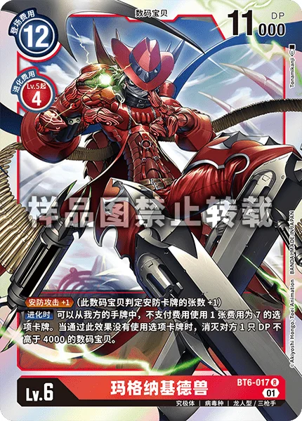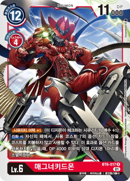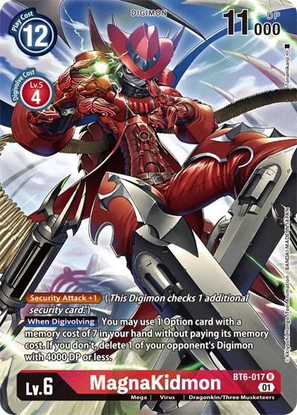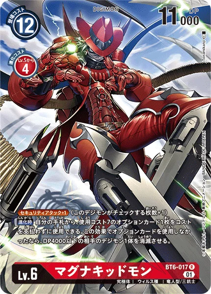 Security Attack +1 (This Digimon checks 1 additional security card.)When Digivolving You may use 1 Option card with a memory cost of 7 in your hand without paying its memory cost. If you don't, delete 1 of your opponent's Digimon with 4000 DP or less.