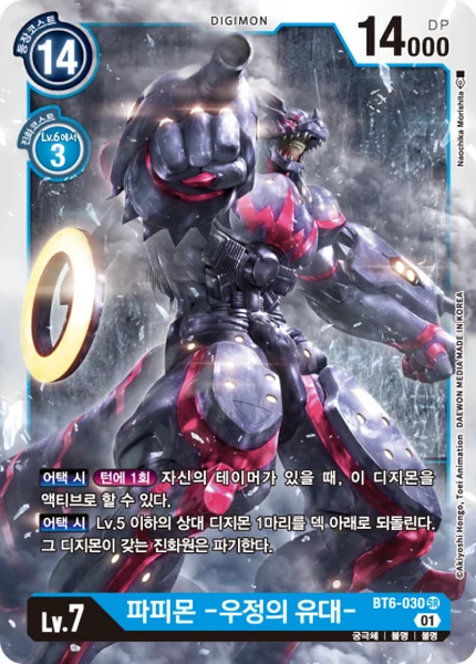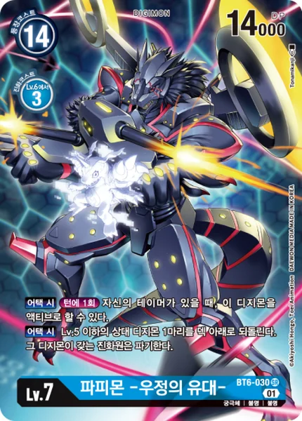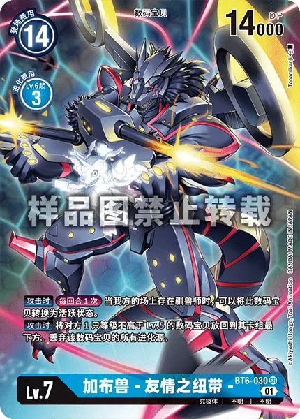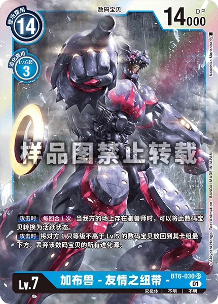 When AttackingOnce Per Turn If you have a Tamer in play, you may unsuspend this Digimon.When Attacking Return 1 of your opponent's level 5 or lower Digimon to the bottom of its owner's deck. Trash all of the digivolution cards of that Digimon.