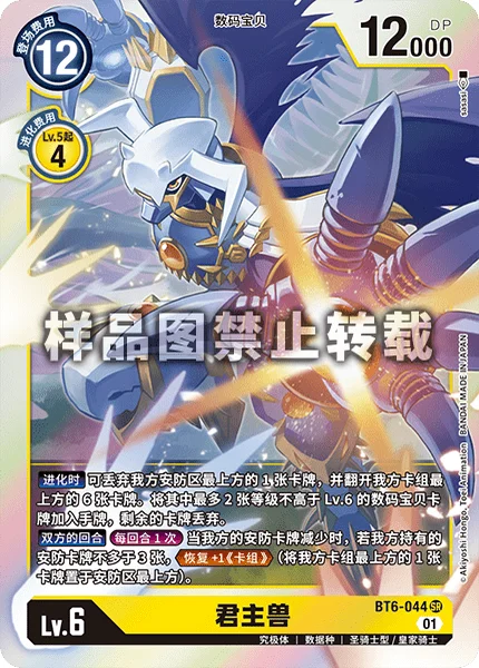 When Digivolving You may trash the top card of your security stack to reveal the top 6 cards of your deck. Add up to 2 level 6 or lower Digimon cards among them to your hand. Trash the remaining cards.All TurnsOnce Per Turn When a card is removed from your security stack, if you have 3 or fewer security cards, trigger Recovery +1 (Deck). (Place the top card of your deck on top of your security stack.)