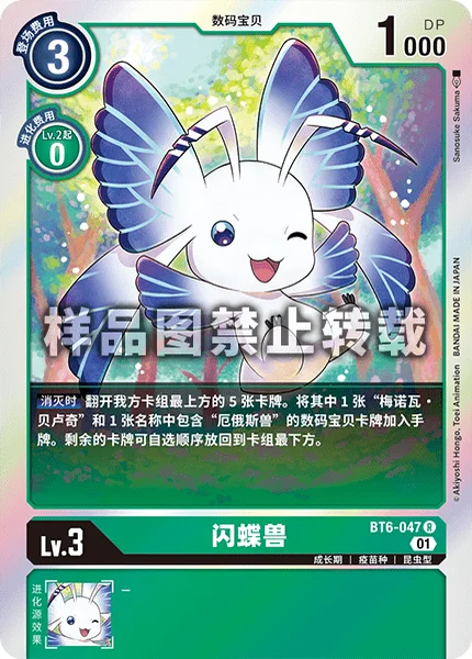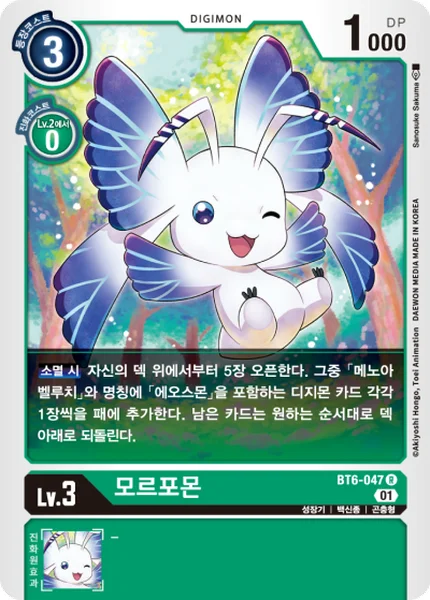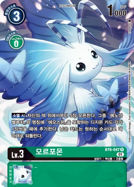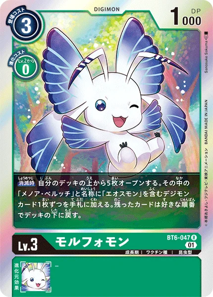 On Deletion Reveal the top 5 cards of your deck. Add 1 [Menoa Bellucci] and 1 Digimon card with [Eosmon] in its name among them to your hand. Place the remaining cards at the bottom of your deck in any order.