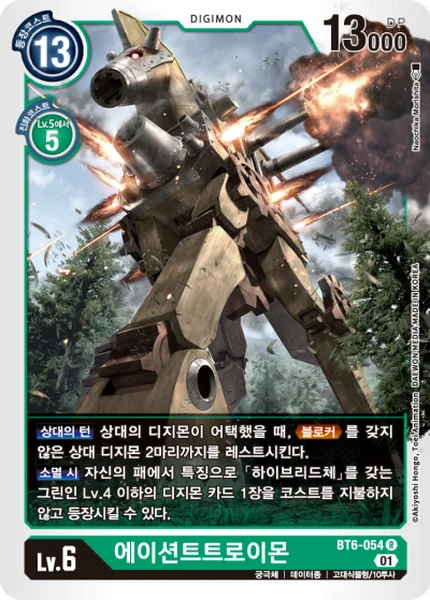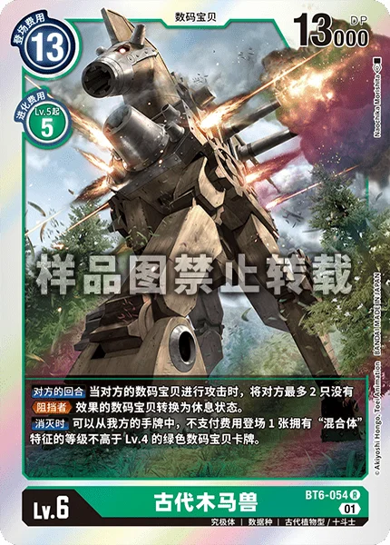 Opponent's Turn When an opponent's Digimon attacks, suspend up to 2 of their Digimon without Blocker.On Deletion You may play 1 green level 4 or lower Digimon card with [Hybrid] in its form from your hand without paying its memory cost.