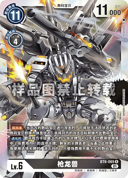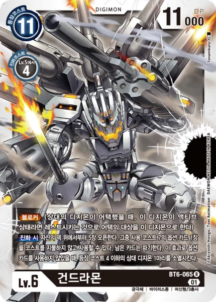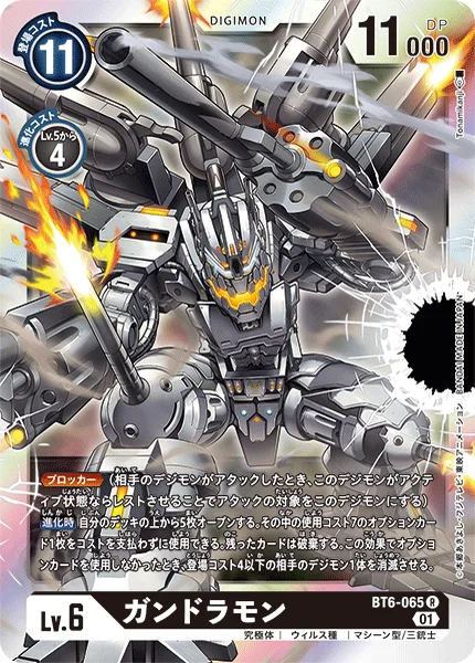 Blocker (When an opponent's Digimon attacks, you may suspend this Digimon to force the opponent to attack it instead.)When Digivolving Reveal the top 5 cards of your deck. You may use 1 Option card with a memory cost of 7 among them without paying its memory cost. Trash the remaining cards. If you don't use an Option card with this effect, delete 1 of your opponent's Digimon with a play cost of 4 or less.