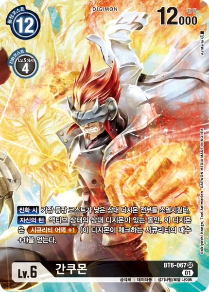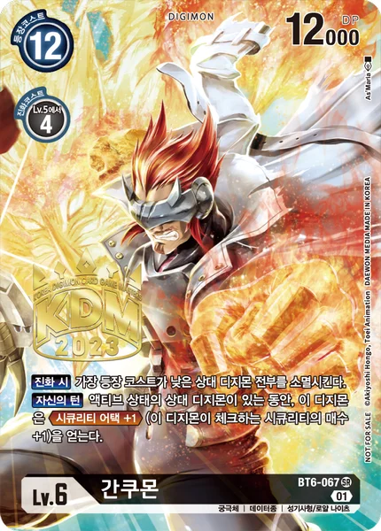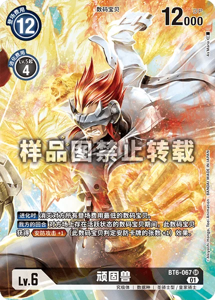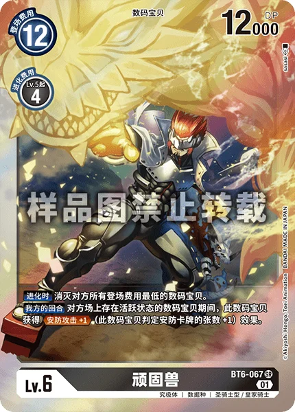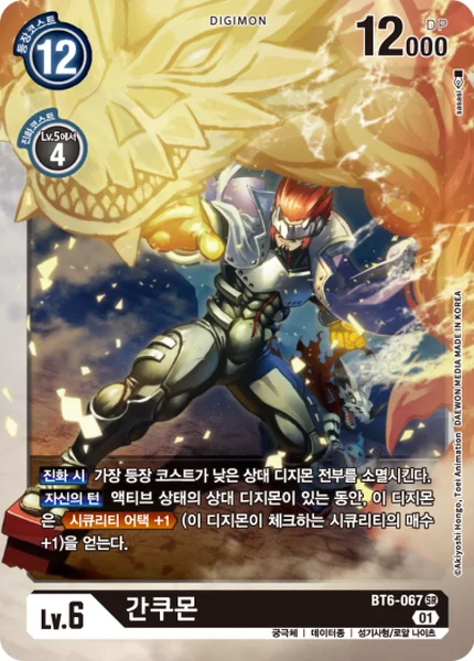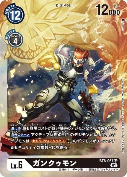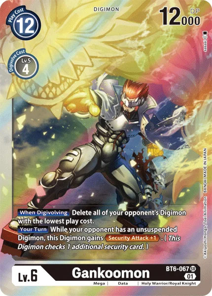 When Digivolving Delete all of your opponent's Digimon with the lowest play cost.Your Turn While your opponent has an unsuspended Digimon, this Digimon gains Security Attack +1. (This Digimon checks 1 additional security card.)