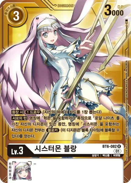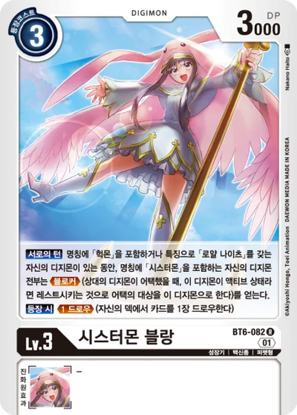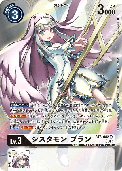 All Turns While you have a Digimon with [Huckmon] in its name or [Royal Knight] in its type in play, all of your Digimon with [Sistermon] in their names gain Blocker. (When an opponent's Digimon attacks, you may suspend this Digimon to force the opponent to attack it instead.)On Play Trigger Draw 1. (Draw 1 card from your deck.)