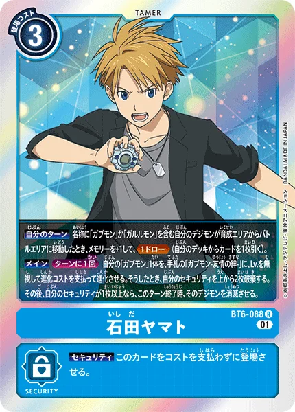 MainOnce Per Turn Digivolve your [Gabumon] into 1 [Gabumon - Bond of Friendship] in your hand for its digivolution cost, ignoring its level. If you do, trash the top 2 cards of your security stack. Then, if you have 1 or more security cards, delete that Digimon at the end of the turn.