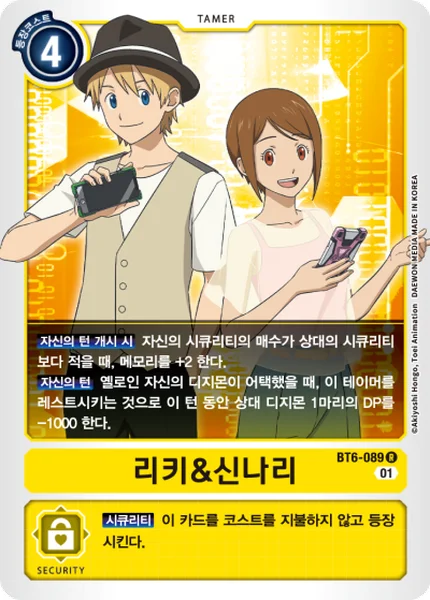 Start of Your Turn If you have fewer security cards than your opponent, gain 2 memory.Your Turn When one of your yellow Digimon attacks, you may suspend this Tamer to have 1 of your opponent's Digimon get -1000 DP for the turn.