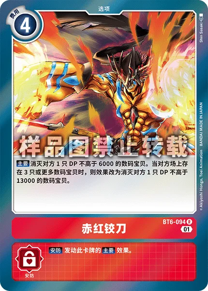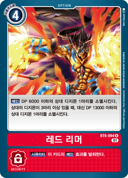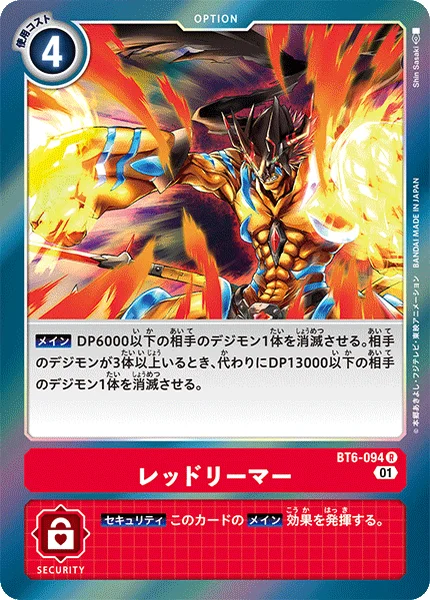 Main Delete 1 of your opponent's Digimon with 6000 DP or less. If your opponent has 3 or more Digimon in play, delete 1 of your opponent's Digimon with 13000 DP or less instead.