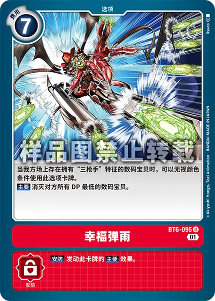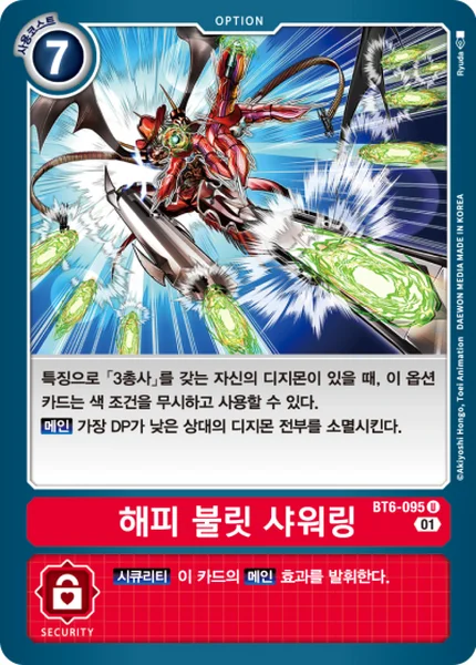 If you have a Digimon with [Three Musketeers] in its type in play, you may use this Option card without meeting its color requirements.Main Delete all of your opponent's Digimon with the lowest DP.