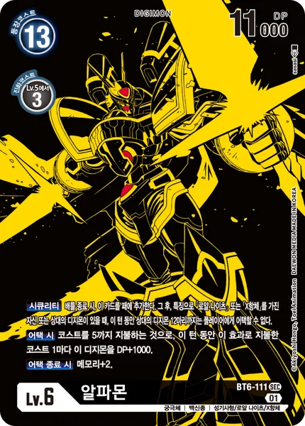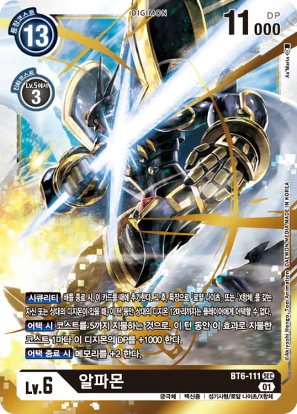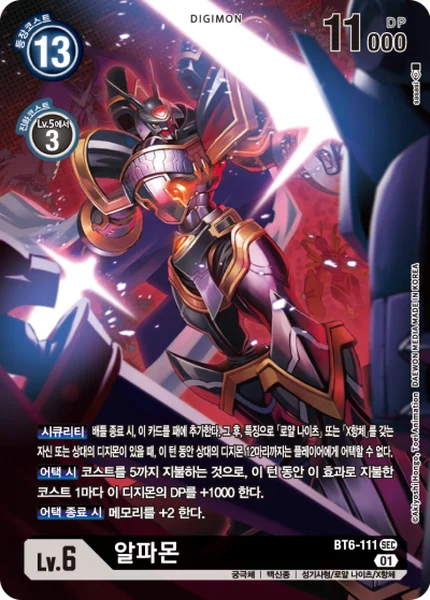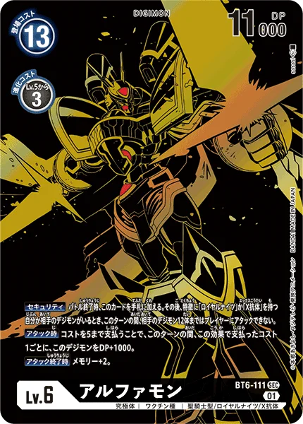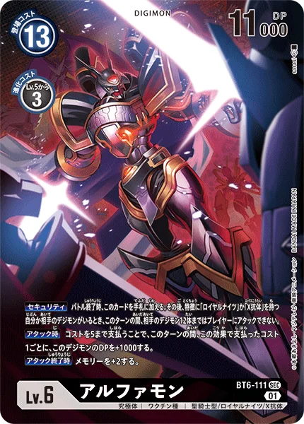 Security At the end of the battle, add this card to your hand. Then, if a Digimon with [Royal Knight] or [X Antibody] in its type is in play, up to 12 of your opponent's Digimon can't attack players for the turn.When Attacking You may pay up to 5 memory. If you do, this Digimon gets +1000 DP for the turn for each memory paid.End of Attack Gain 2 memory.