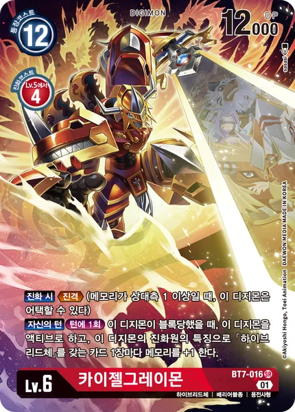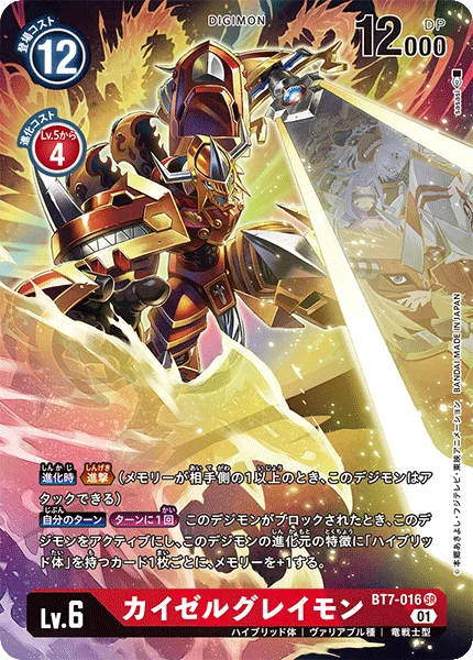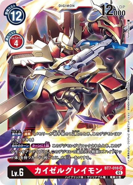 When Digivolving Blitz (This Digimon can attack when your opponent has 1 or more memory.)Your TurnOnce Per Turn When this Digimon is blocked, unsuspend it, and gain 1 memory for each digivolution card this Digimon has with [Hybrid] in its traits.