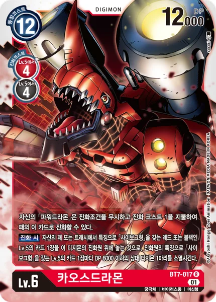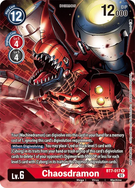 Your [Machinedramon] can digivolve into this card in your hand for a memory cost of 1, ignoring this card's digivolution requirements. When Digivolving You may place 1 red or black level 5 card with [Cyborg] in its traits from your hand or trash on top of this card's digivolution cards to delete 1 of your opponent's Digimon with 6000 DP or less for each level 5 card with [Cyborg] in its traits in this Digimon's digivolution cards.