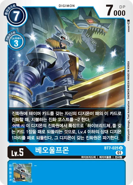 When one of your Digimon with a Tamer card in its digivolution cards digivolves into this card in your hand, reduce the memory cost of the digivolution by 2. When Attacking You may return 1 card with [Hybrid] in its traits from this Digimon's digivolution cards to your hand to return 1 of your opponent's level 4 or lower Digimon to its owner's hand. Trash all of the digivolution cards of that Digimon.