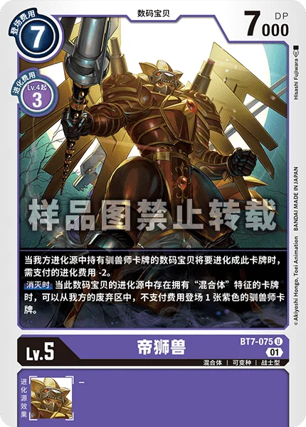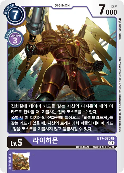 When one of your Digimon with a Tamer card in its digivolution cards digivolves into this card in your hand, reduce the memory cost of the digivolution by 2. On Deletion If a card with [Hybrid] in its traits is in this Digimon's digivolution cards, you may play 1 purple Tamer card from your trash without paying its memory cost.