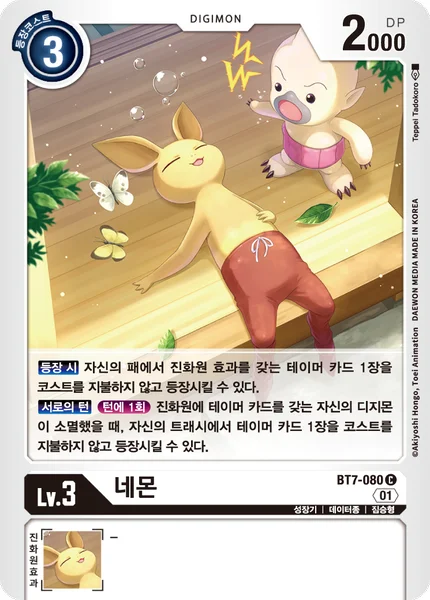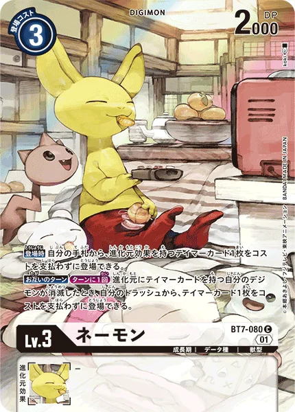 On Play You may play 1 Tamer card with an inherited effect from your hand without paying its memory cost. All TurnsOnce Per Turn When one of your Digimon with a Tamer card in its digivolution cards is deleted, you may play 1 Tamer card from your trash without paying its memory cost.