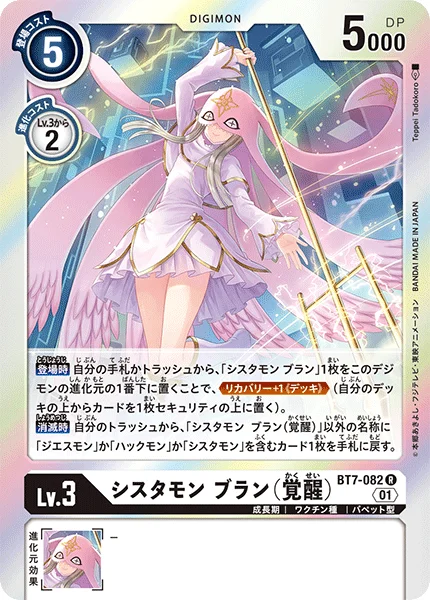 On Play You may place 1 [Sistermon Blanc] from your hand or trash at the bottom of this Digimon's digivolution cards to Recovery +1 (Deck). (Place the top card of your deck on top of your security stack.) On Deletion Return 1 card with [Jesmon], [Huckmon], or [Sistermon] in its name other than [Sistermon Blanc (Awakened)] from your trash to your hand.