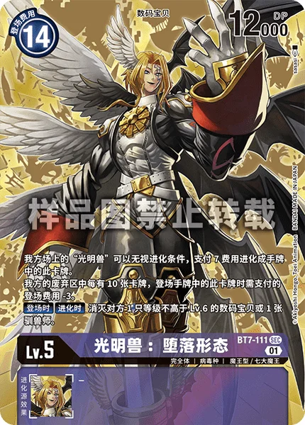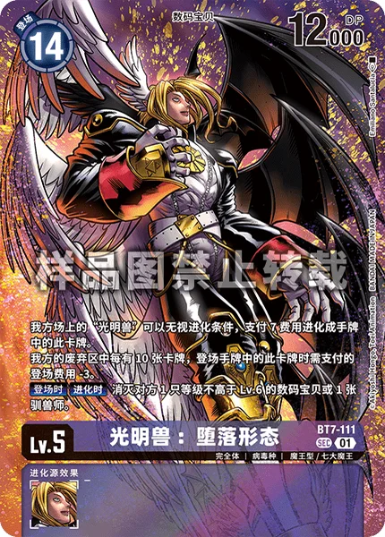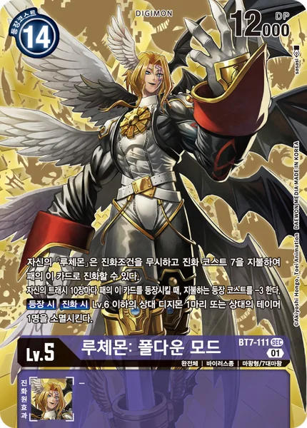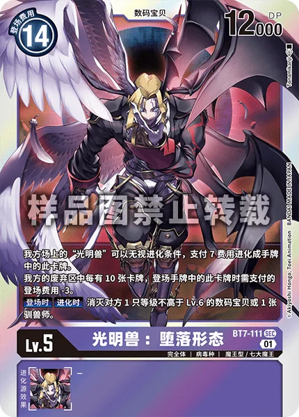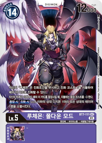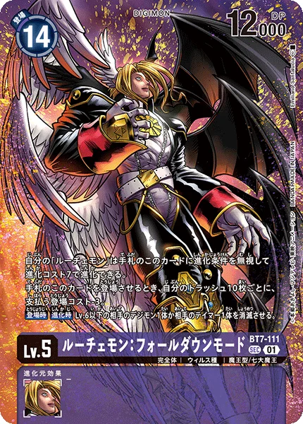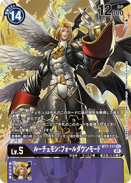 Your [Lucemon] can digivolve into this card in your hand for a memory cost of 7, ignoring this card's digivolution requirements. For every 10 cards in your trash, reduce the memory cost when playing this card from your hand by 3. On PlayWhen Digivolving Delete 1 of your opponent's Tamers or level 6 or lower Digimon.
