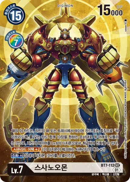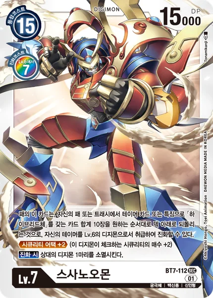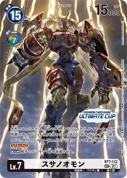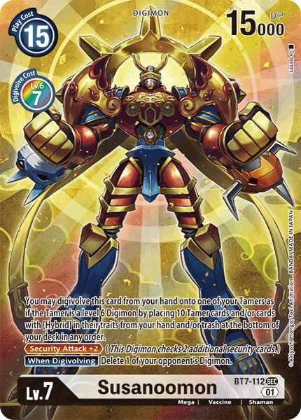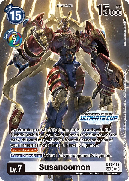 You may digivolve this card from your hand onto one of your Tamers as if the Tamer is a level 6 Digimon by placing 10 Tamer cards and/or cards with [Hybrid] in their traits from your hand and/or trash at the bottom of your deck in any order. Security Attack +2 (This Digimon checks 2 additional security cards.)When Digivolving Delete 1 of your opponent's Digimon.