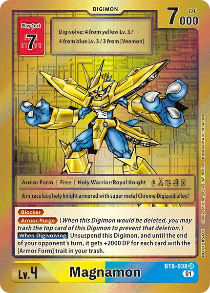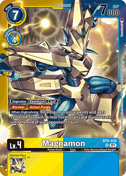 Digivolve 3 from [Veemon]BlockerArmor Purge (When this Digimon would be deleted, you may trash the top card of this Digimon to prevent that deletion.)When Digivolving Unsuspend this Digimon, and it gets +2000 DP until the end of your opponent's next turn for each card with [Armor Form] in its traits in your trash.
